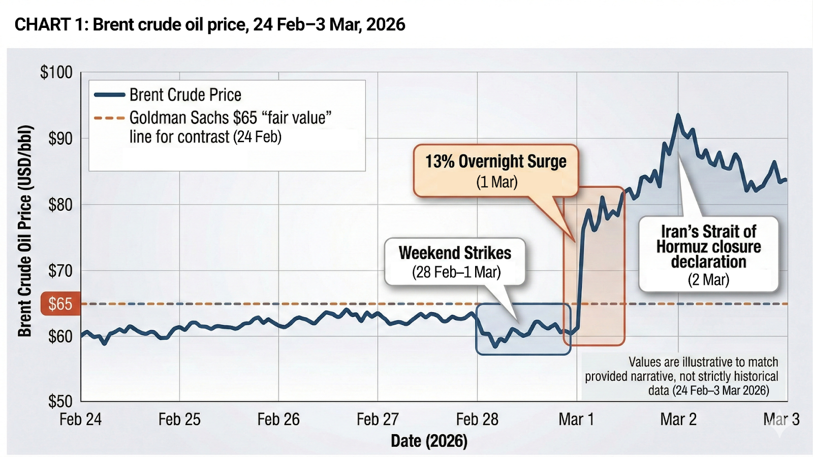Oil has surged over 13% since Sunday night. Brent crude hit the high $70s — its highest since January 2025. European natural gas jumped 38% on Monday and another 20% on Tuesday. Diesel futures are up nearly 25% in two sessions. Goldman Sachs estimates the current oil price implies the market is pricing a supply disruption lasting roughly four weeks. If it goes longer, analysts are warning of $100 oil and comparisons to the 1970s energy crisis.